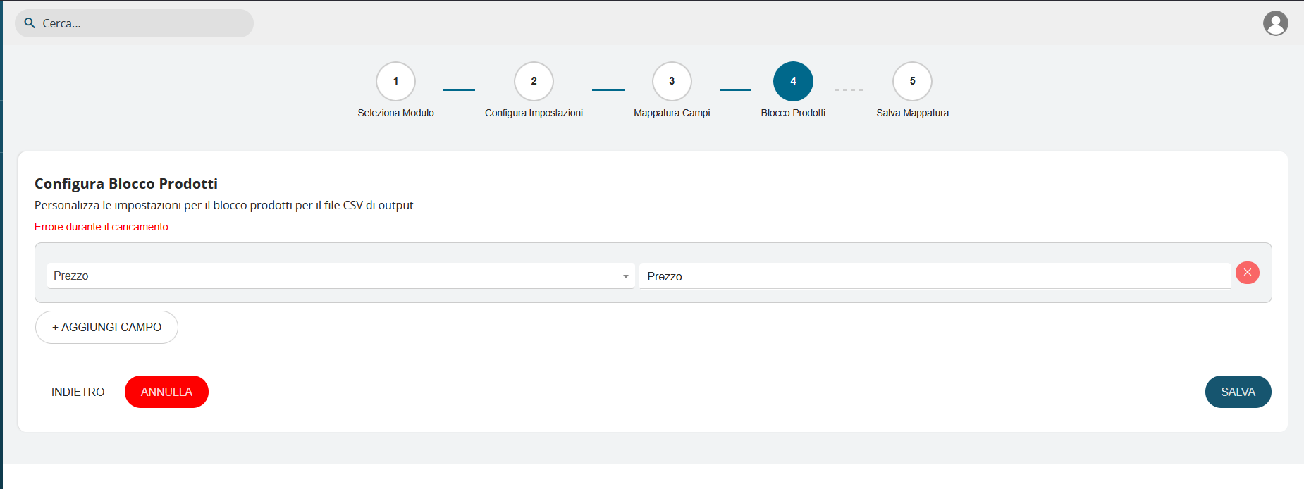 The screen maintains the same mapping structure as Step 3, but focuses exclusively on product-related fields. The system presents all available fields for products of the selected module, allowing targeted selection of information to export.