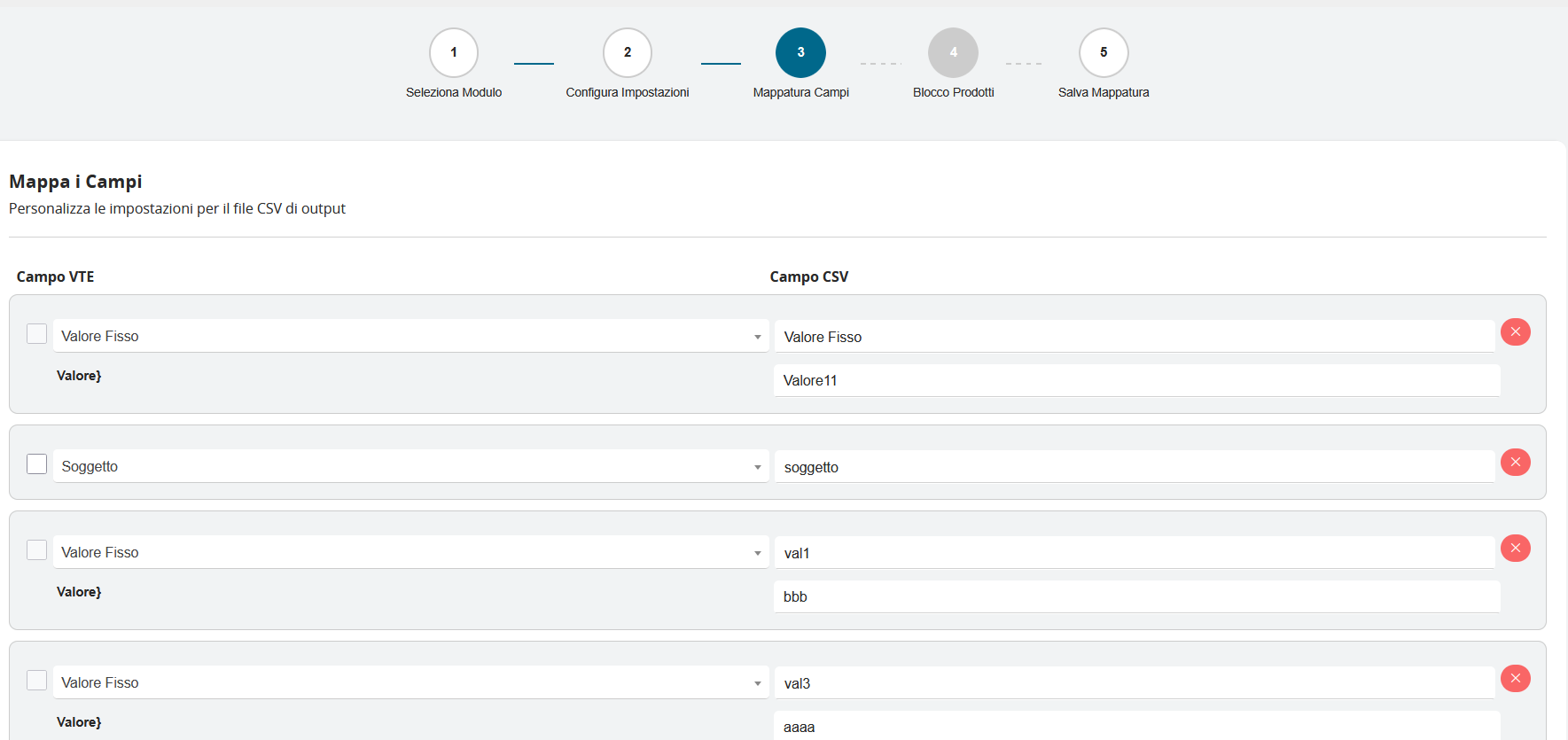 The third step defines the correspondence between VTE module fields and the columns that will appear in the final CSV file. This phase is crucial for determining which information will be exported and how it will be structured.