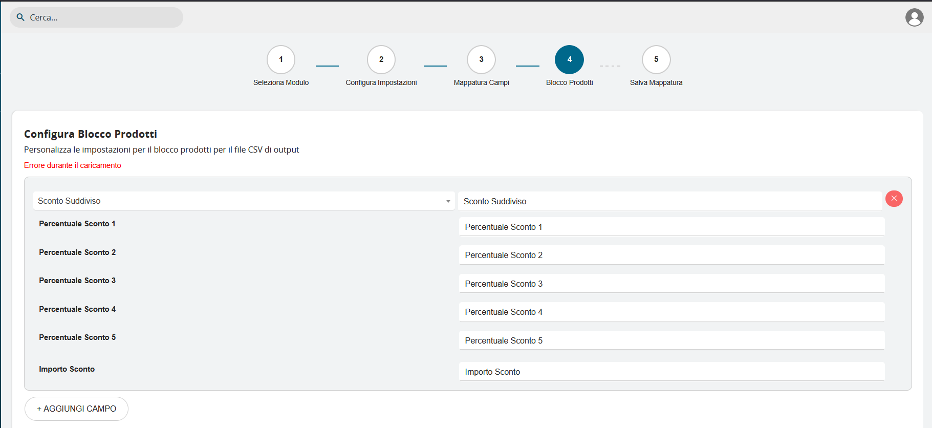 Colonna Campo CSV: Permette di definire come questi campi prodotto appariranno nel file CSV finale, con la possibilità di personalizzare completamente i nomi delle colonne.