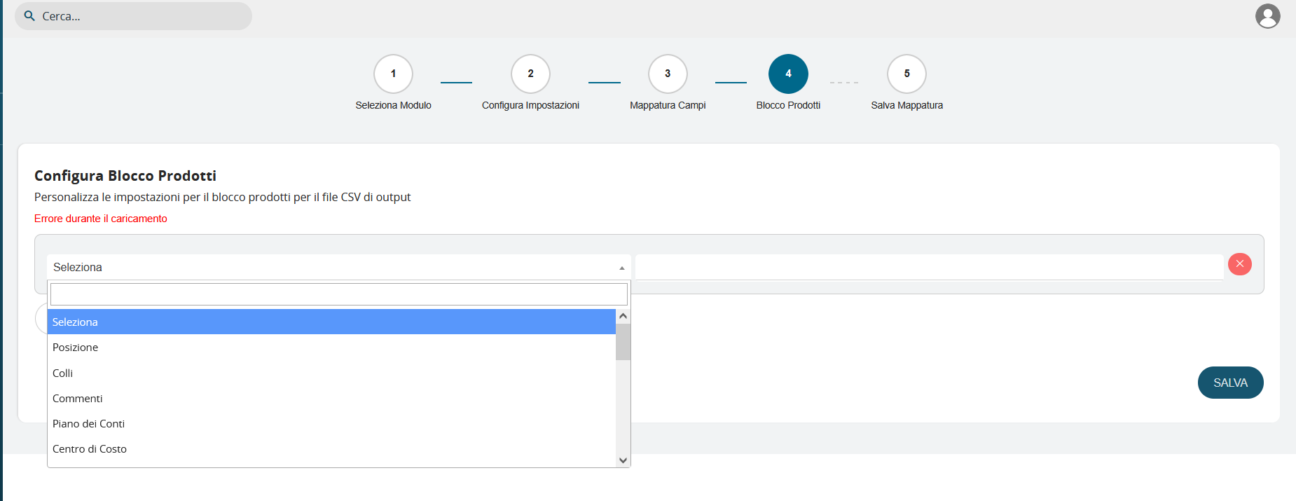 La schermata mantiene la stessa struttura di mappatura del Passaggio 3, ma si concentra esclusivamente sui campi relativi ai prodotti. Il sistema presenta tutti i campi disponibili per i prodotti del modulo selezionato, permettendo una selezione mirata delle informazioni da esportare.