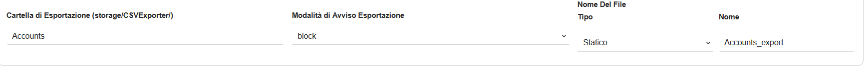 - Esempio: `storage/CSVExporter/Accounts/` per il modulo Account - Modalità di Avviso Esportazione: controlla come l'utente viene informato al completamento dell'operazione tramite: