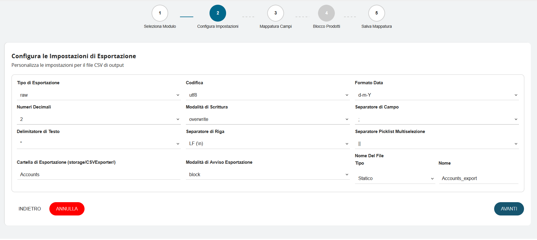 Il secondo passaggio del wizard rappresenta il cuore della configurazione tecnica, dove vengono definiti tutti i parametri che determinano come i dati verranno estratti, formattati e salvati nel file CSV finale. Questa sezione è suddivisa in diverse aree tematiche che consentono un controllo granulare su ogni aspetto dell'esportazione: