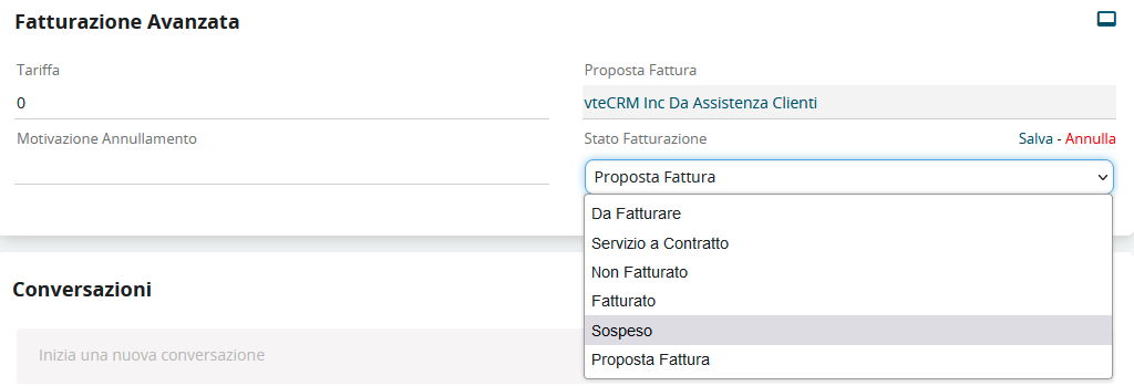 è uno stato che viene automaticamente impostato dal sistema quando a seguito di una generazione di una proposta fattura quest'ultima venga tramutata in una fattura - Sospeso