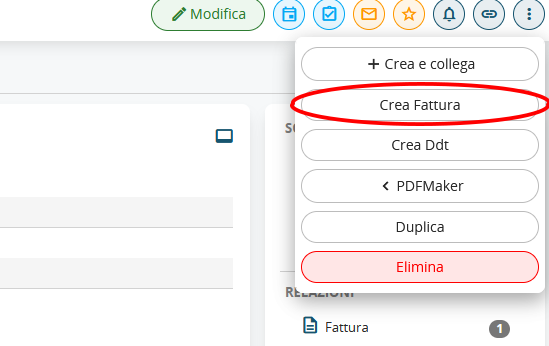 La generazione della fattura di saldo è prevista con il bottone nativo di vtenext nel menu "altro" in alto a sinistra