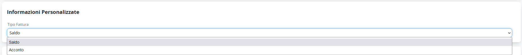 Effettuando questa operazione vi apparirà la schermata di generazione della fattura, è molto importante che la fattura venga segnata come a "Saldo" nel campo apposito "Tipo Fattura" che trovate qui sotto, solitamente in un'installazione standard del modulo è sempre riportato come primo valore del menù a tendina.