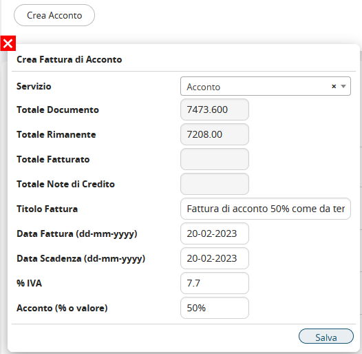Cliccando questo bottone, vi apparirà un popup che vi permetterà di effettuare una fattura di acconto in vtenext.