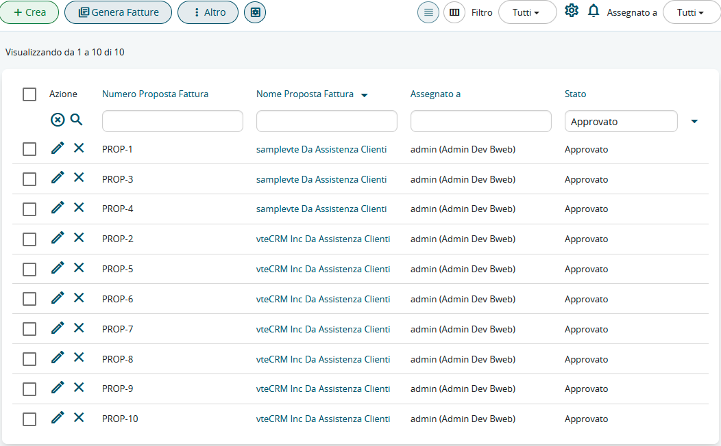 Un volta eseguito questo passaggio tornando in lista delle proposte fatture, si potra eseguire la creazione massiva di tutte le fatture selezionando tutte le proposte fattura approvate e cliccando sul bottone "Genera Fatture" che si trova a fianco del tasto crea.