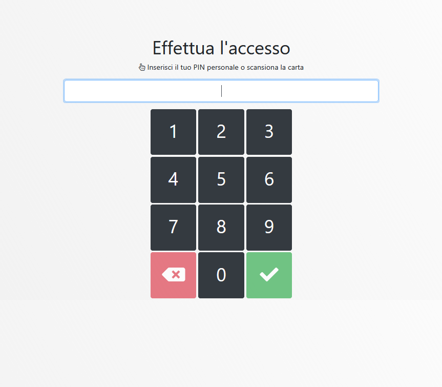 L'interfaccia di login presenta una tastiera numerica touch con i numeri da 0 a 9, più i tasti di conferma (verde con segno di spunta) e cancellazione (rosso con X). Questo design semplificato garantisce facilità d'uso anche in ambiente industriale e con guanti da lavoro.