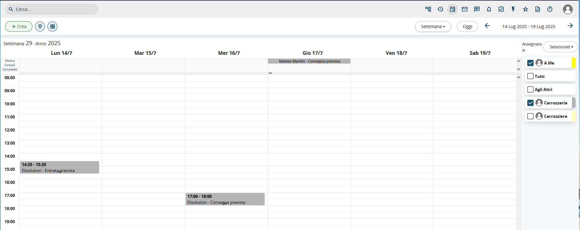 Tali eventi relativi alle auto di cortesia vengono automaticamente registrati nel calendario dell'utente denominato "Carrozzeria". In questo calendario dedicato potrete visualizzare chiaramente tutte le notifiche di consegna e ritiro dei veicoli, con le relative informazioni sul cliente e sul veicolo assegnato.
