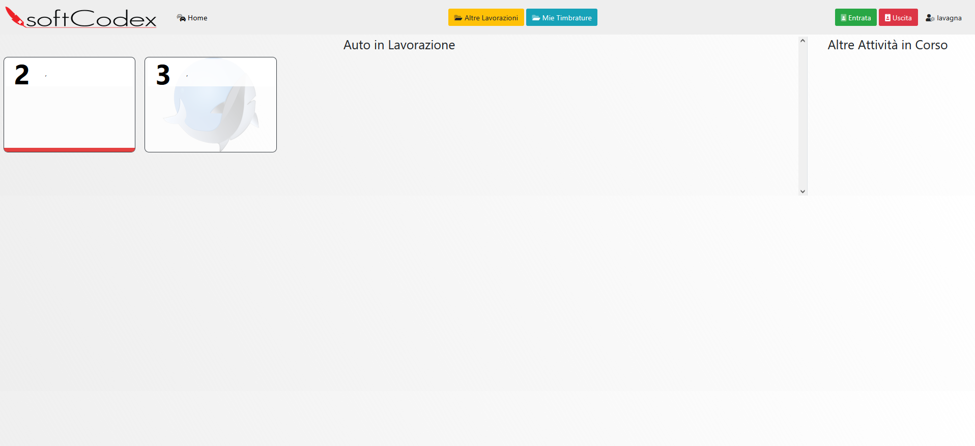 Una volta effettuato l'accesso, la lavagna presenta un'interfaccia ottimizzata per l'ambiente di lavoro della carrozzeria. La schermata principale mostra le sezioni "Auto in Lavorazione" e "Altre Attività in Corso", permettendo ai collaboratori di visualizzare immediatamente le attività disponibili.