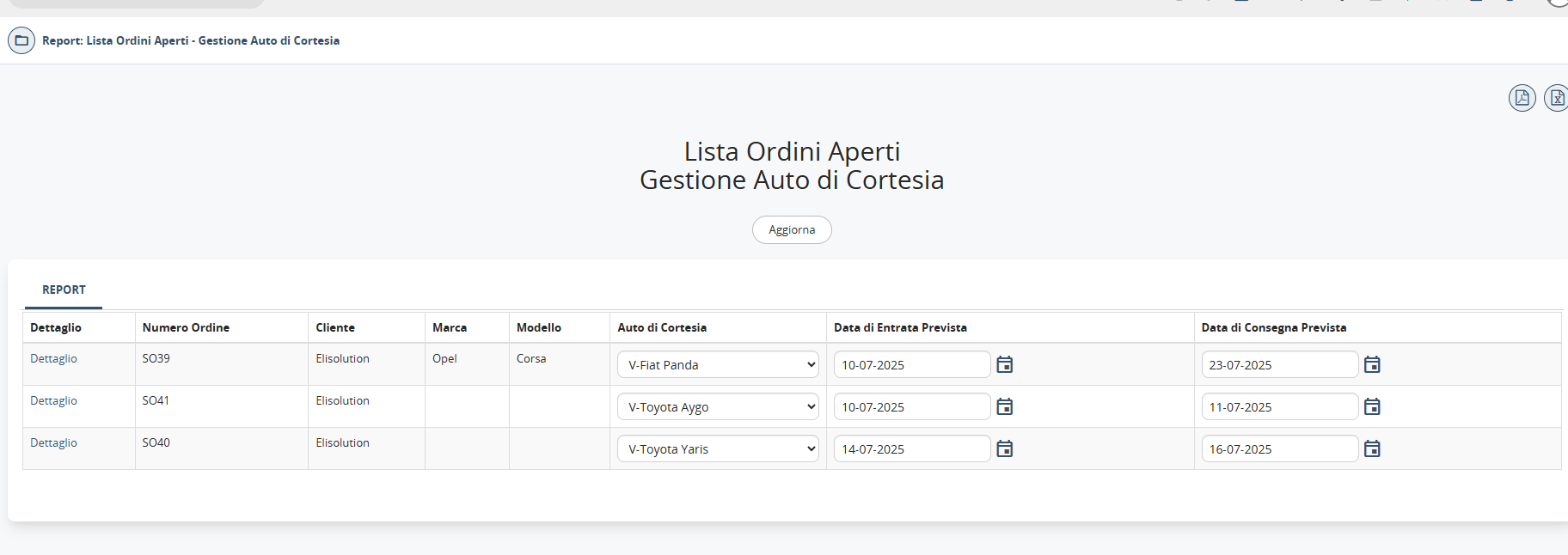 Il report non è solo consultivo ma offre anche funzionalità operative dirette. Attraverso il menu a tendina nella colonna "Auto di Cortesia", è possibile modificare direttamente l'assegnazione dei veicoli senza dover accedere ai singoli ordini di lavoro. Questa funzionalità è particolarmente utile per ottimizzazioni dell'ultimo minuto o per gestire imprevisti nella disponibilità dei veicoli.
