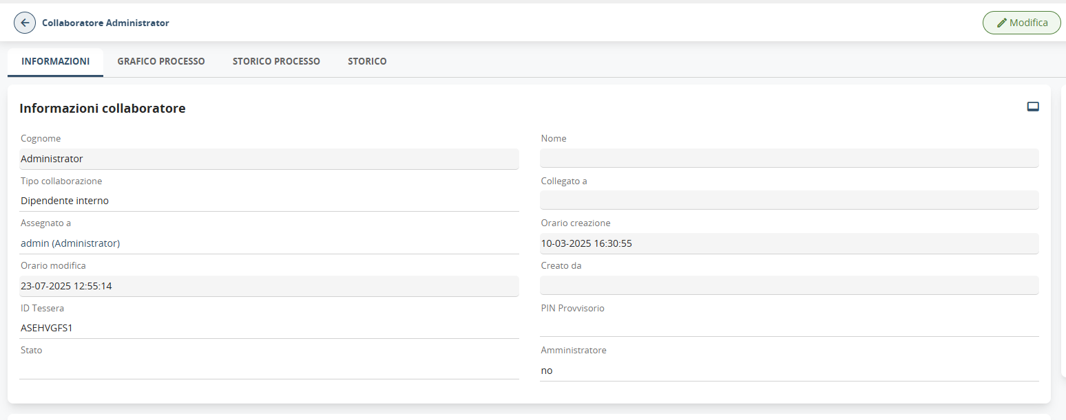 Il modulo Collaboratori si popola automaticamente durante la fase di creazione degli utenti gestita da SoftCodex. Come visibile dalla schermata del collaboratore "Administrator", ogni profilo contiene informazioni dettagliate tra cui cognome, tipo di collaborazione ("Dipendente interno" nell'esempio), data di assegnazione, stato attivo e informazioni di contatto.