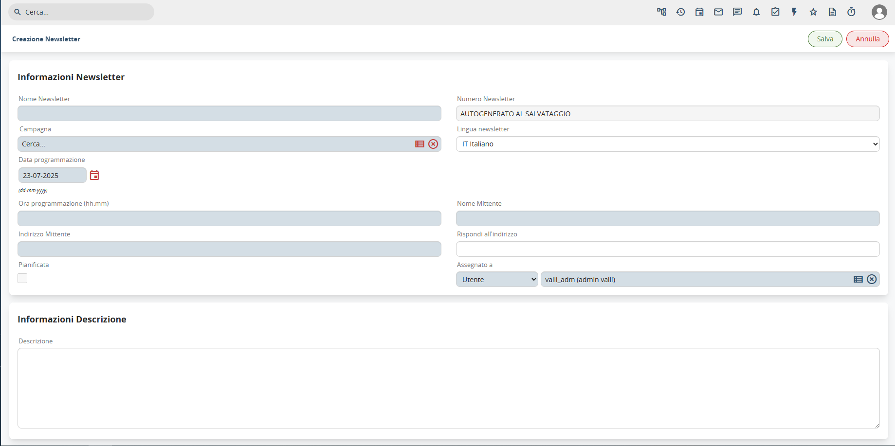 Un aspetto fondamentale visibile nell'interfaccia è il campo "Campagna" che dimostra come ogni newsletter sia necessariamente collegata a una strategia marketing più ampia. Questa integrazione permette di: