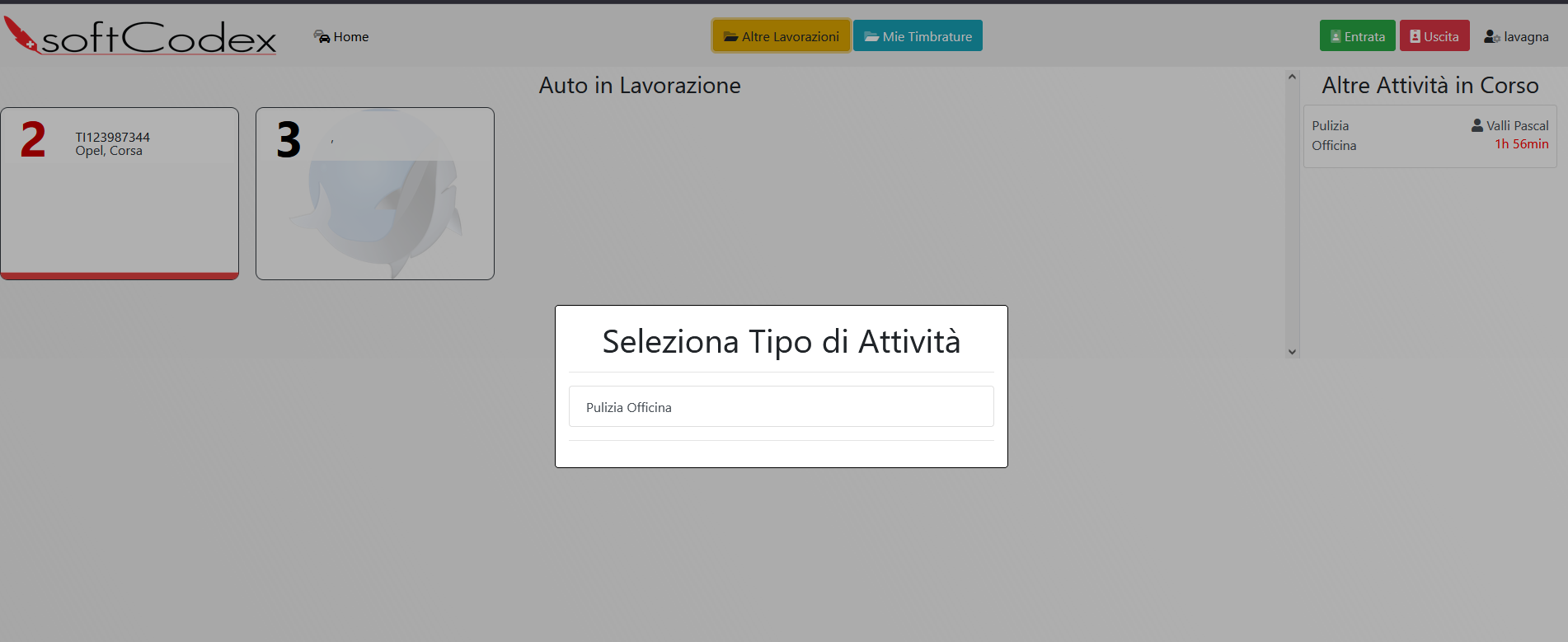 Cliccando sul pulsante "Altre Lavorazioni", il collaboratore può selezionare da una lista predefinita l'attività che sta per svolgere, oppure inserire una descrizione personalizzata. Anche per queste attività il sistema registra con precisione le ore dedicate, permettendo un controllo completo di tutte le ore lavorative senza eccezioni.